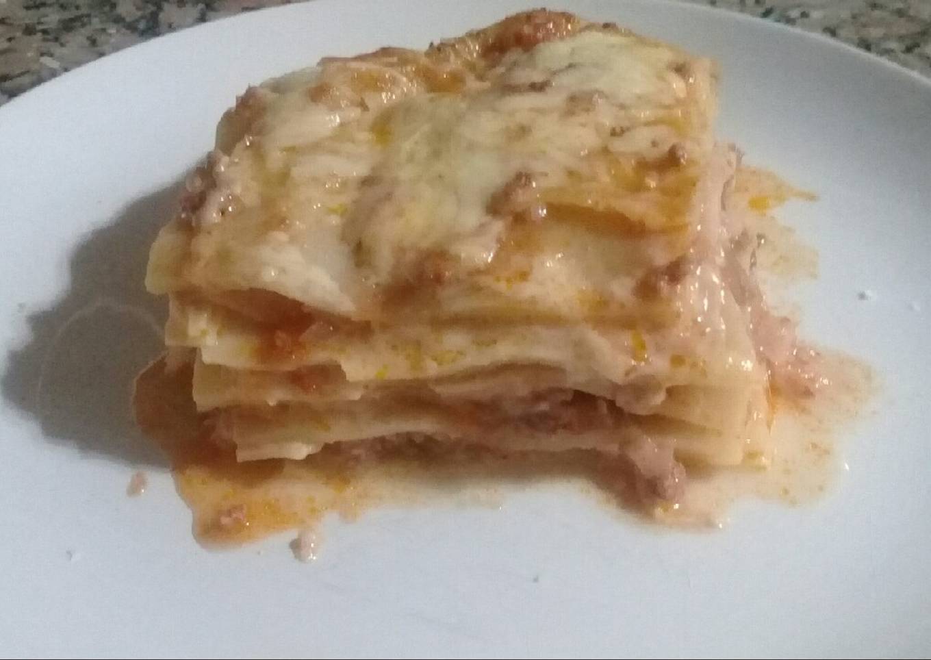 - Colocar un poco de la salsa que se formó al cocinar la carne picada sobre la asadera y cubrir el fondo con una capa de lasagna, luego agregar una capa de paleta y queso de máquina, colocar una capa de picada, cortar unos trozos de queso mantecoso y cerrar con otra capa de lasagna.