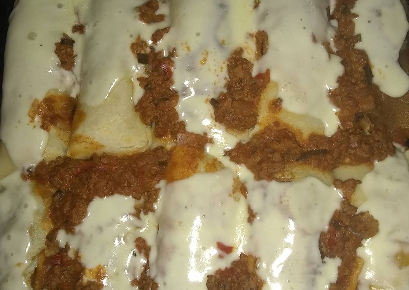 - Envolver los panqueques con el relleno, colocar en una fuerte, colocar queso cremoso encima y colocar salsa por encima yo hice una salsa para el final con medio de carne picada, cebollas, y pimiento rojo...