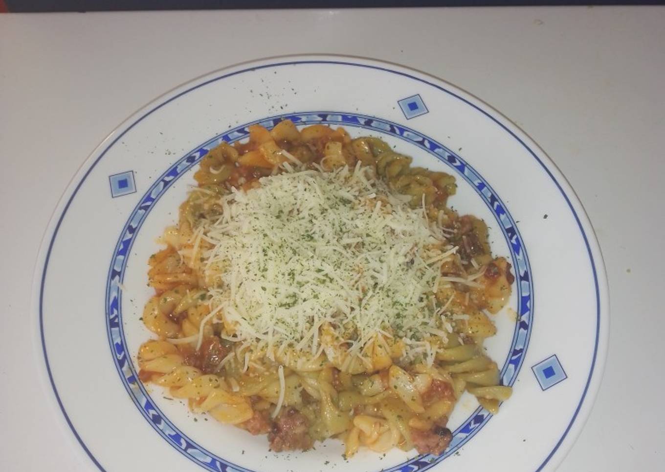 - Por último se escurren las espirales y se añaden en una sartén junto con la carne picada con todo, y se le da vueltas bien y se le echa el tomate frito.Y cuando lo vayas a servir en plato se añade al gusto el queso rallado👩🍳🍴😋 Espero que os guste...