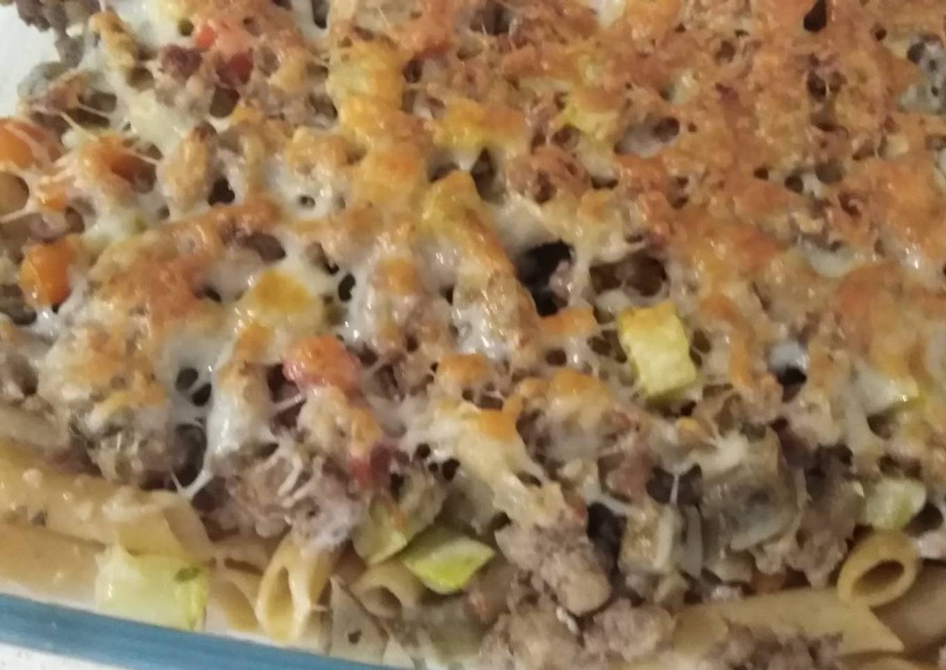 - Escurrir la pasta y colocar en una fuente de horno. Echar por encima las verduras y la carne