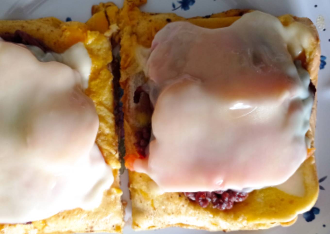 - En la sartén echar los huevos batidos, poner las lonchas de pan encima del huevo y una vez pringadas las damos la vuelta y la volvemos a poner otra vez encima del huevo, ahora poner encima la hamburguesa, el tomate y el queso