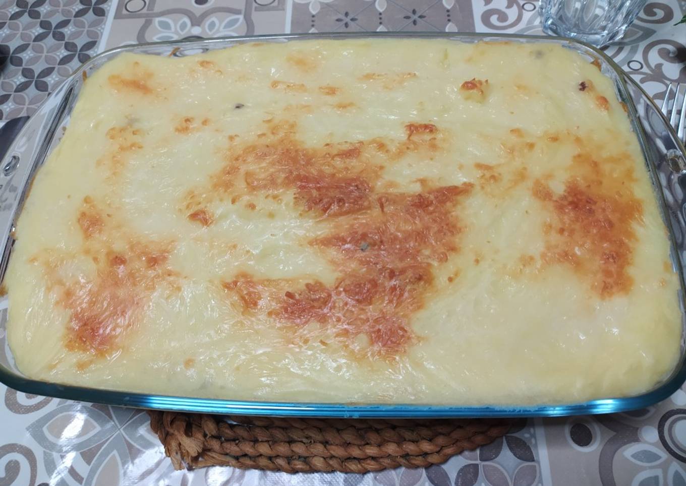 - Cuando hayamos echado el huevo picado, volvemos a echar lo que nos queda de carne picada y ponemos la cobertura de puré que nos quedaba.