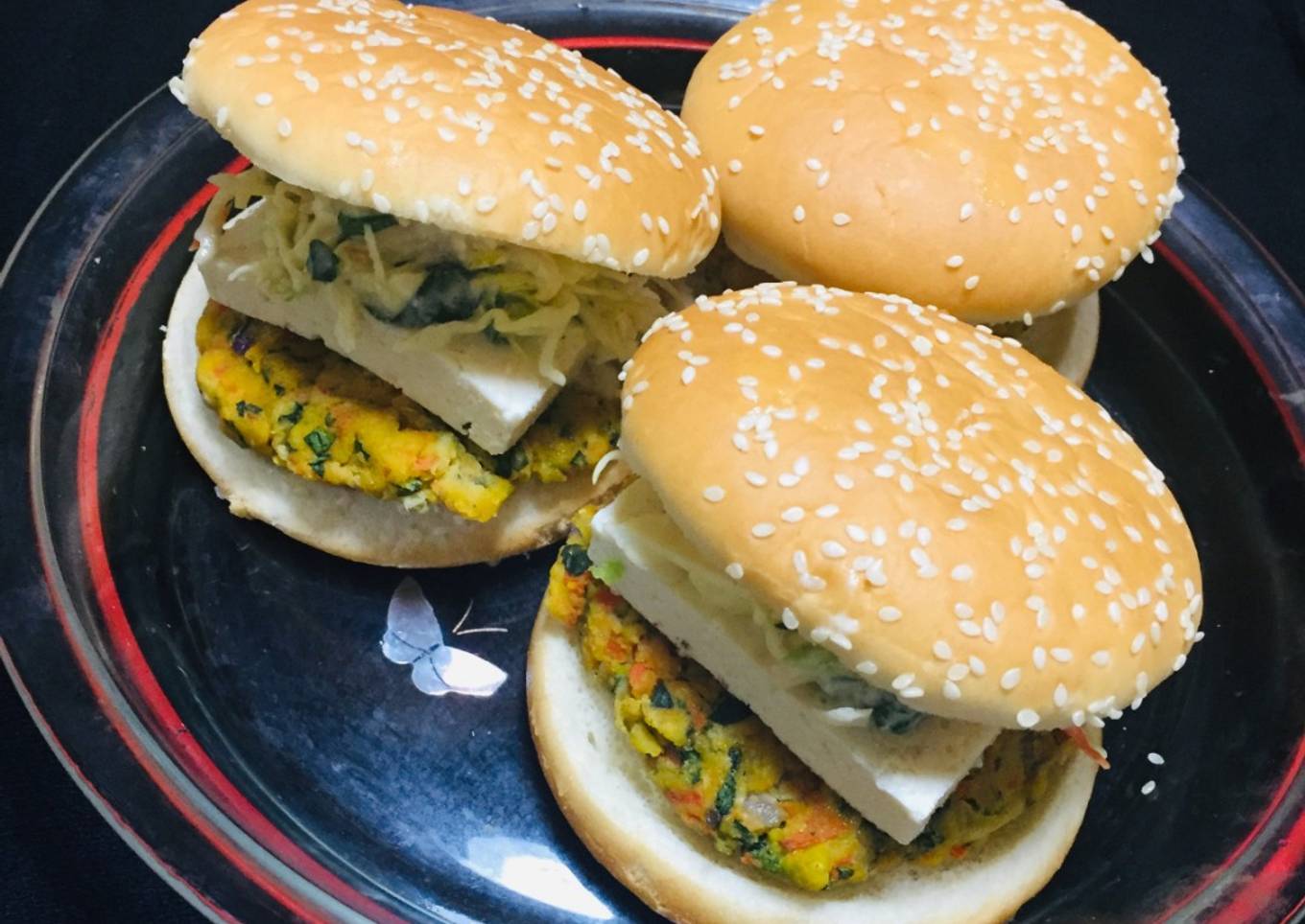 - Tenemos listas las hamburguesas https://cookpad.com/pe/recetas/14743352-hamburguesas-de-garbanzos-vegano-con-espinaca-al-horno-%F0%9F%A5%95%F0%9F%A7%85%F0%9F%8C%BF, el pan, la ensalada: https://cookpad.com/pe/recetas/11512853-ensalada-de-repollo-col-y-zanahoria-al-estilo-kfc y el tofu cortado.