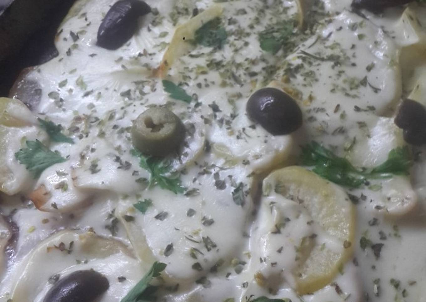 - Llevar a horno fuerte durante 40 minutos aproximadamente...luego cubrir con queso o mozzarella y volver al horno para gratinar... decorar con orégano aceitunas a gusto.
