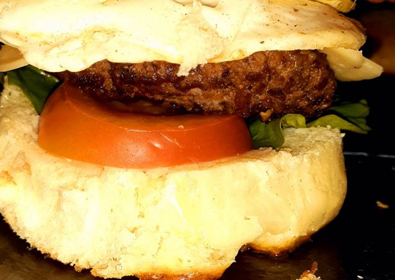 - Momento de armar!!! Cortamos el pan por la mitad y la parte de abajo la vamos a untar con manteca y la vamos a poner a tostar en la misma sartén en la que hicimos la carne hasta que quede doradito, ahora si yo le puse para empezar mayonesa, luego una hojita de lechuga, rodajas de tomate, luego la hamburguesa, después el jamón y queso, el huevo frito y para terminar la panceta frita🤤💥💣