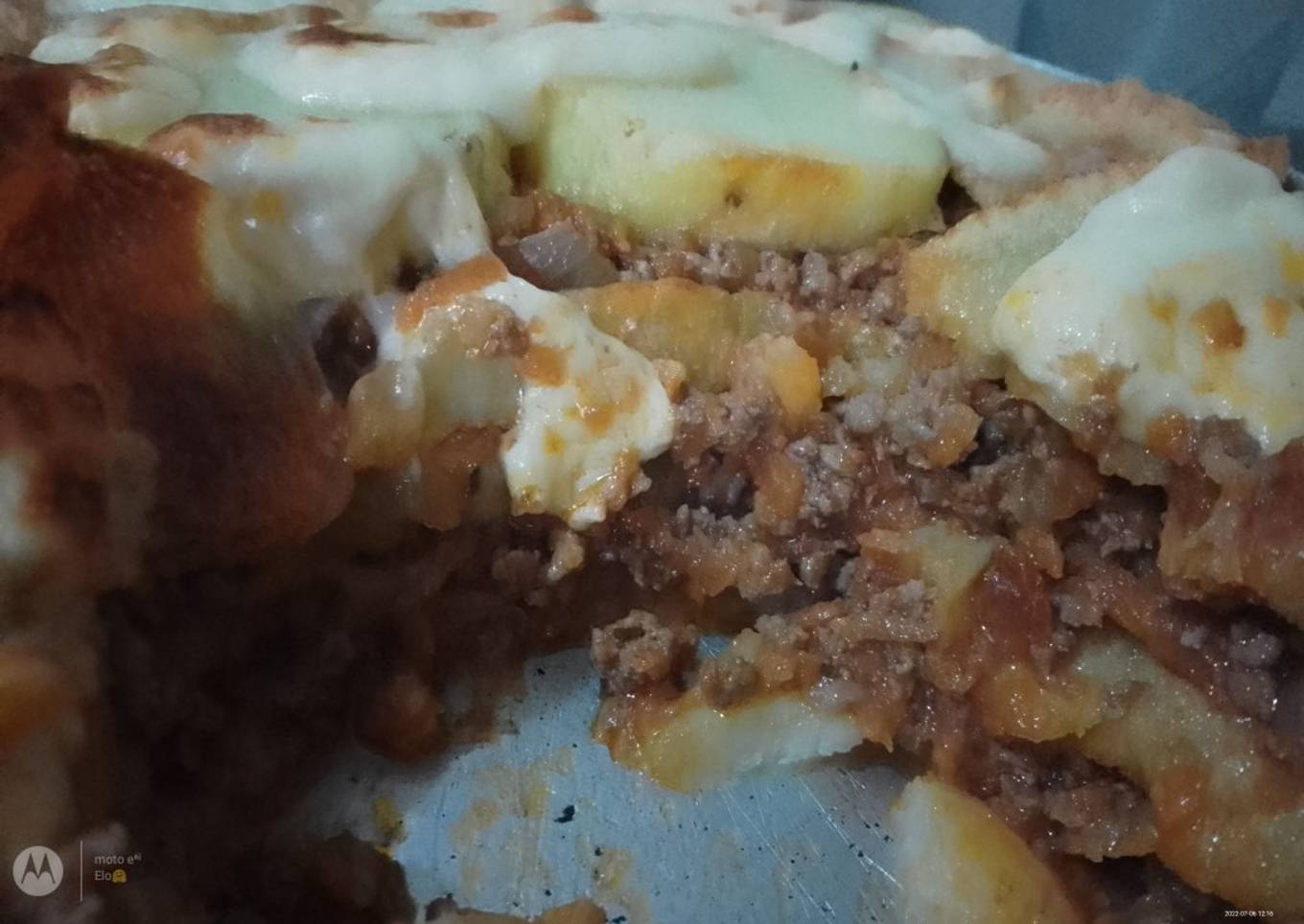 - Alternar otra capa de papas y carne y terminar con papas. Yo le agregué un poquito de cremoso que tenía en la heladera y lo llevé al horno para que se gratine.