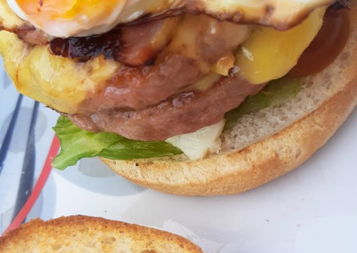 - En la misma sartén freimos el bacon y colocamos. Después freimos el huevo (mejor por las dos caras para que no se desparrame, como a la parrilla y con poco aceite) y también colocamos.