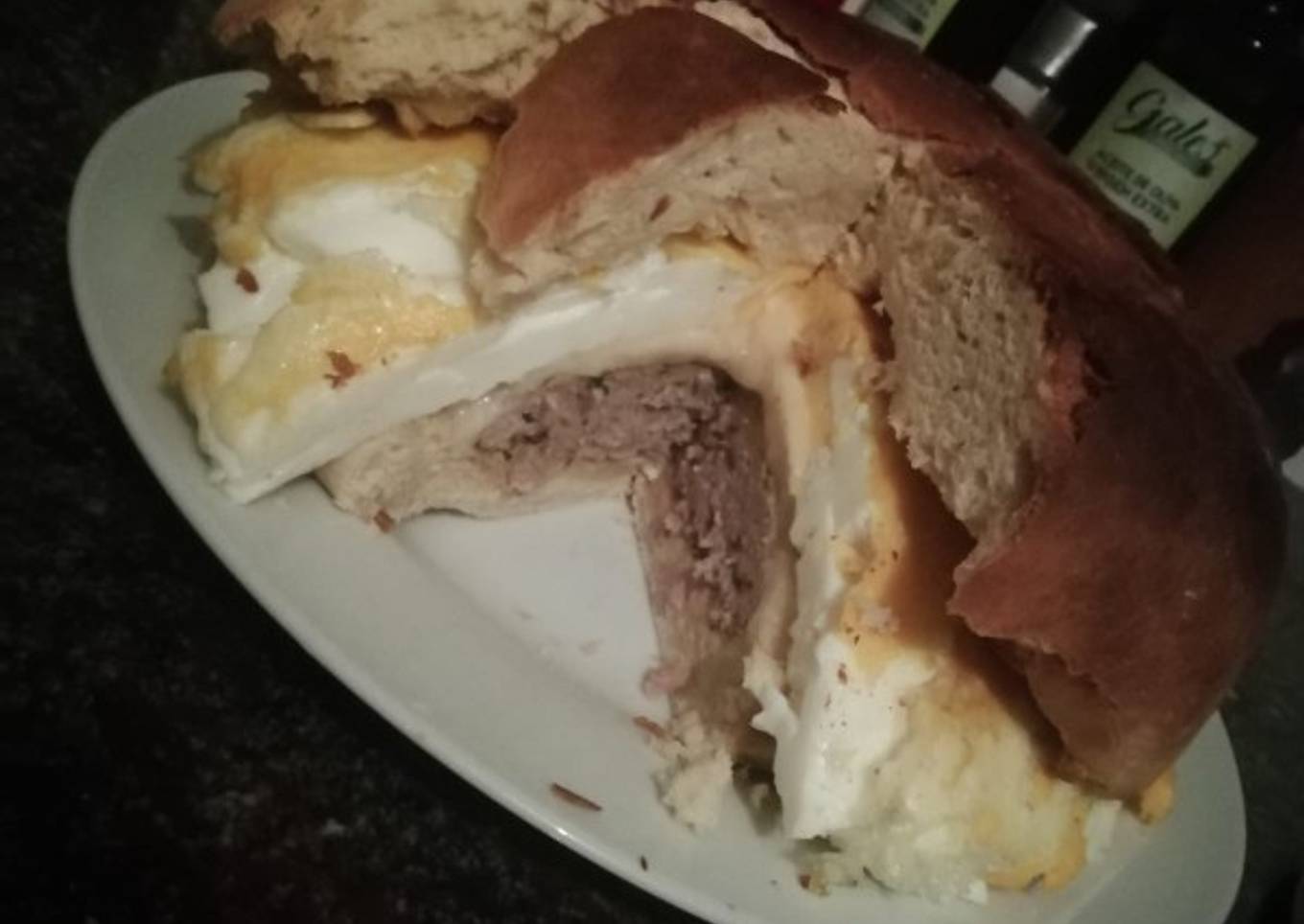 - Cuando el pan est谩 listo lo partimos a la mitad y ponemos la lechuga, cebolla, la hamburguesa, queso, jam贸n cocido, bacon, lomo y huevos fritos y volvemos a tapar.