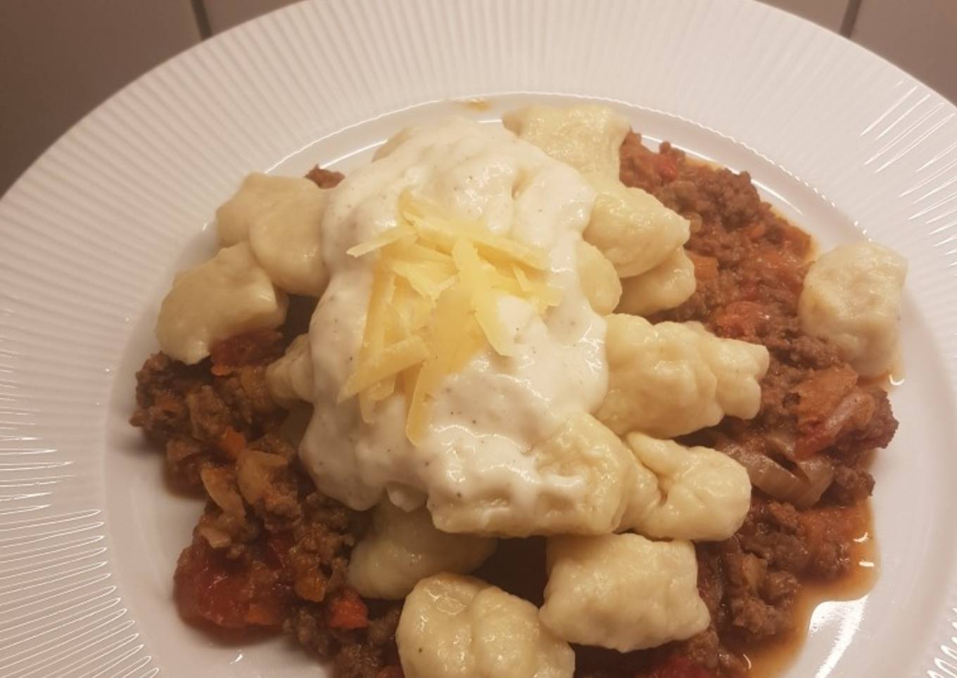 Ñoquis de papá salsa bolognesa y salsa bechamel