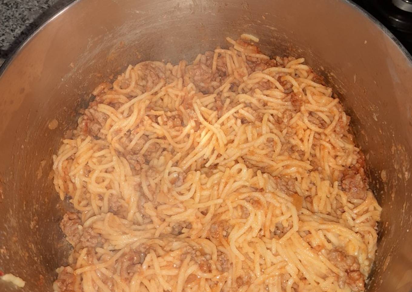 - A continuación, añadiremos la carne con la cebolla y el tomate a la pasta y mezclaremos. Una vez todo mezclado añadiremos un poco más de sal y...LISTO!!!