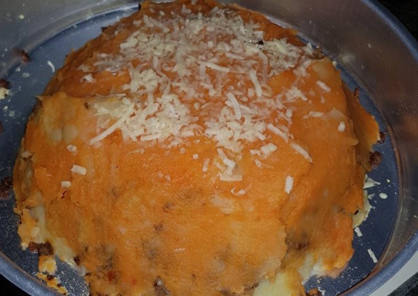 - Cubrir la carne con el pur茅 de zapallo y papas completamente.
