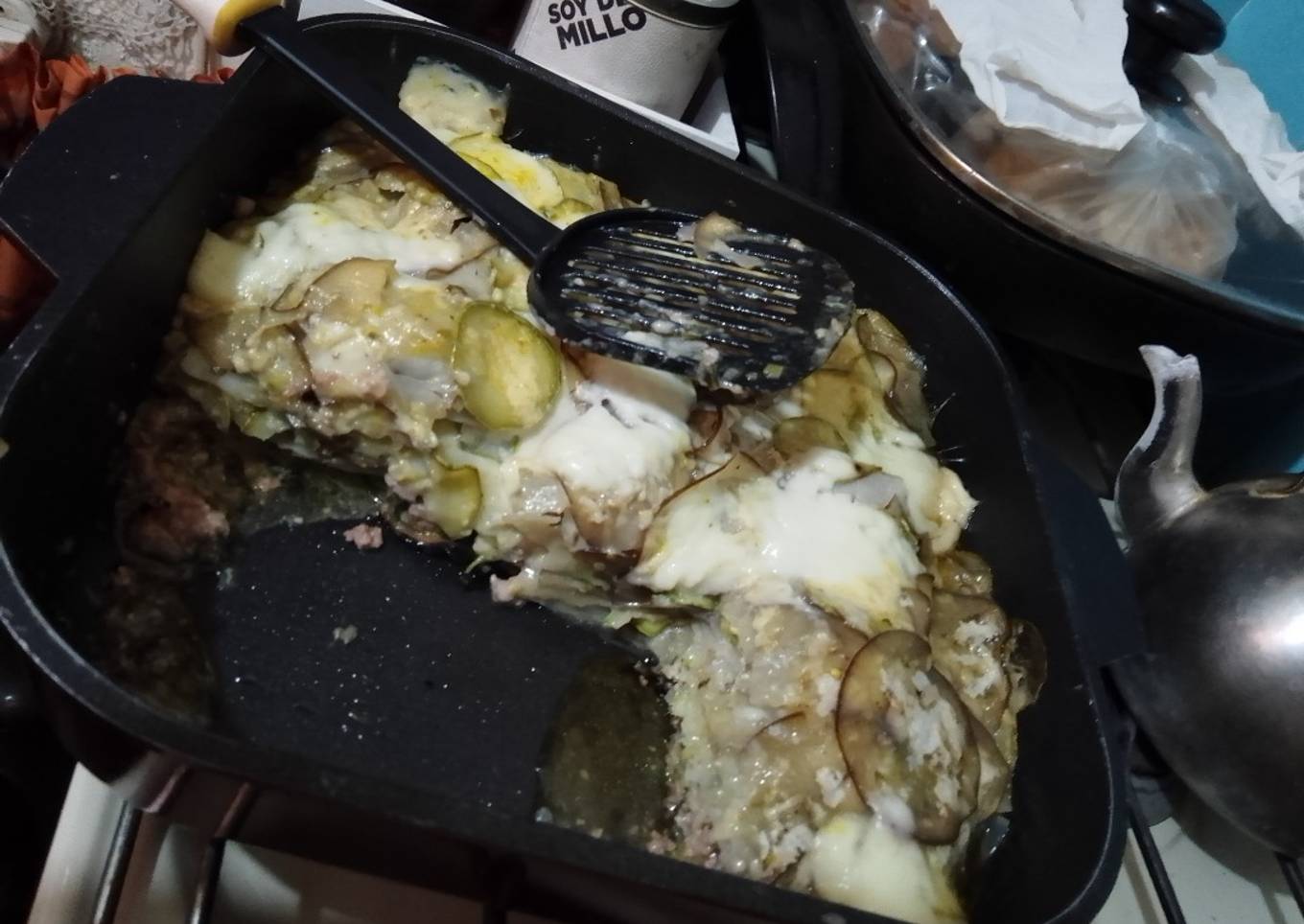 - Proceder al armado: colocar en una fuente para horno, rociada con Rocio vegetal o apenas untada con aceite, una capa de papas; cubrir con relleno, salsa blanca y láminas de queso cremoso. Luego, una capa de berenjenas, y repetimos la operación; luego los zucchinis, relleno y terminamos con vegetales, salsa y queso.