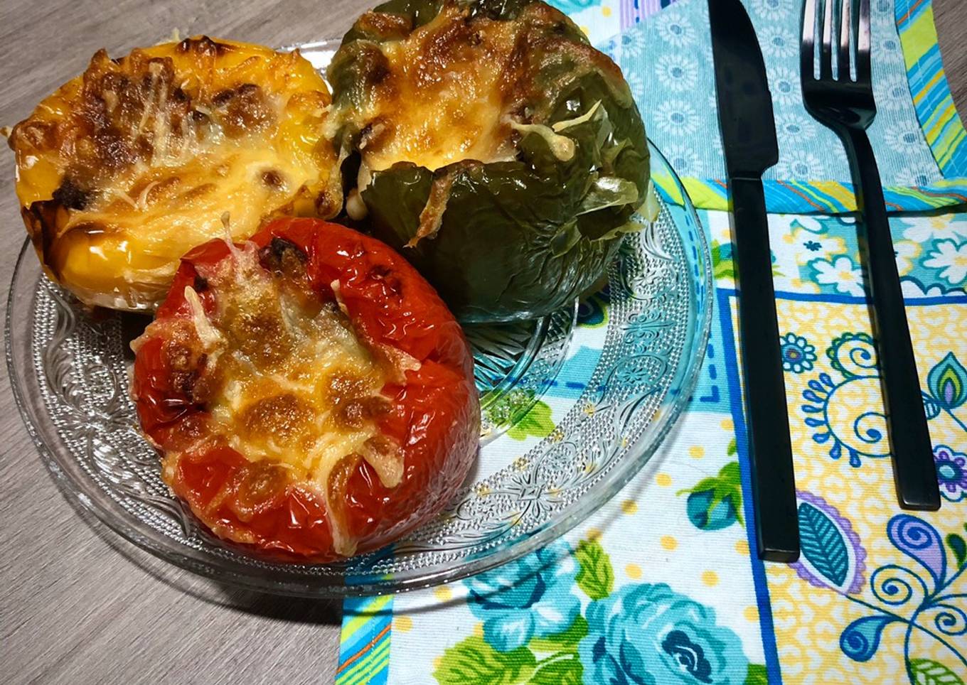 Pimientos tricolor rellenos de boloñesa vegetal