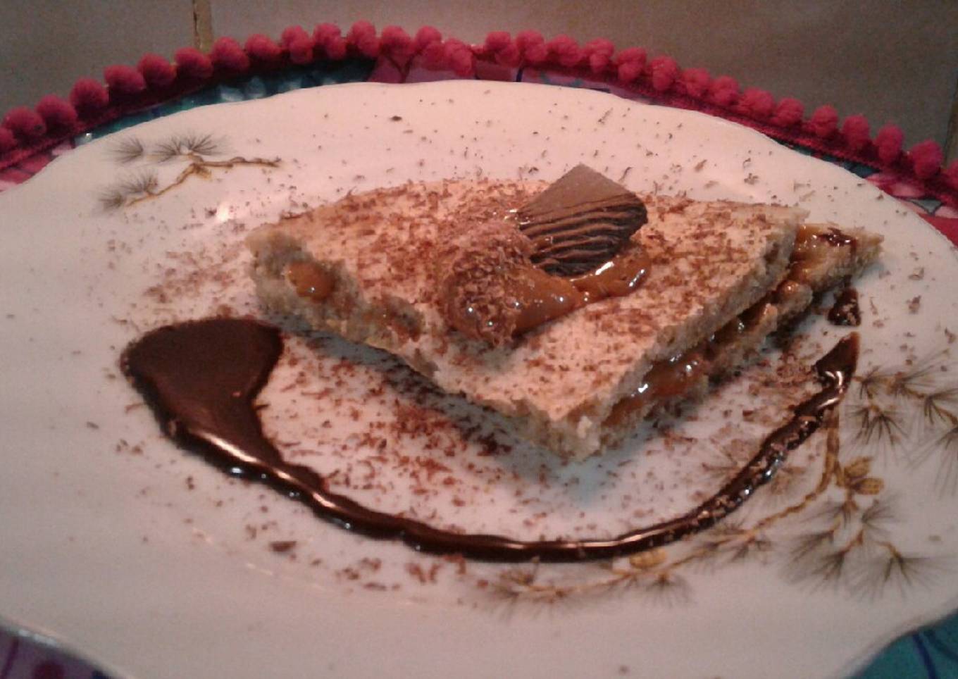 - Lo doblamos triangulitoagregamos dulce de leche arriba rallamos chocolatey colocamos media barra en el dulce. Decoramos con salsa de chocolate.